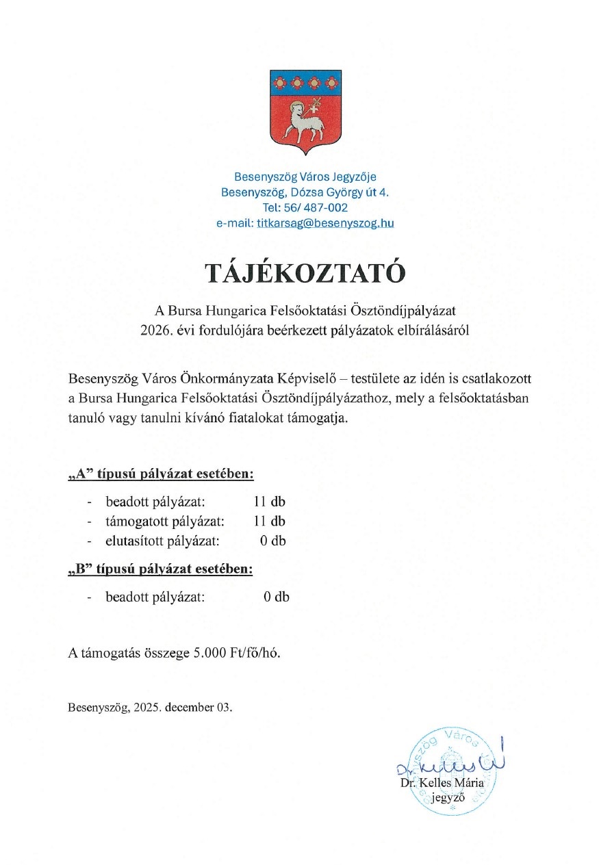 Besenyszög Város Önkormányzata Képviselő-testülete 2025. évi soron következő ülését 2025. november 20.-án (csütörtök) 15.00 órára összehívja.