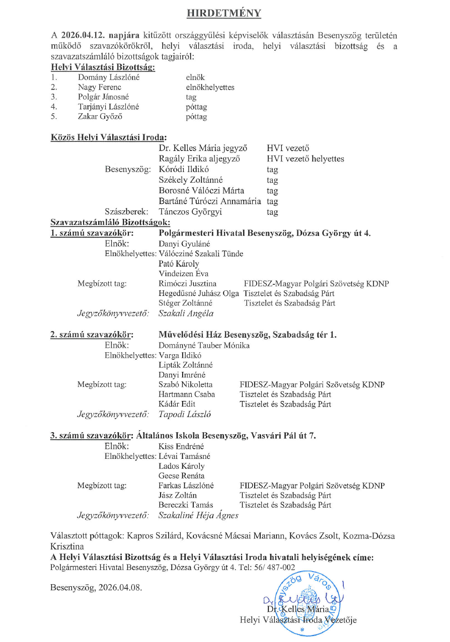 A Jász-Nagykun-Szolnok Vármegyei Kormányhivatal Földhivatali Osztálya a Besenyszög, 061, 063/26, 063/27, 063/7, 063/10, 063/11, 063/13, 063/14, 070, 073, 076/18, 069, 022/1, 0181, 023/1, 035, 032/11, 032/12, 052, 066/11, 067 hrsz. földrészlet megosztása során újonnan kialakult földrészletek bemutatását a természetben 2026. április hónap 09. napján tartja az alábbi időpontokban!