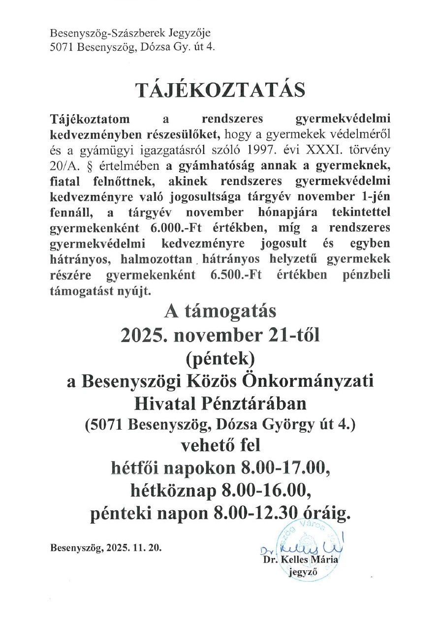 Besenyszög Város Önkormányzata Képviselő-testülete 2025. évi soron következő ülését 2025. november 20.-án (csütörtök) 15.00 órára összehívja.
