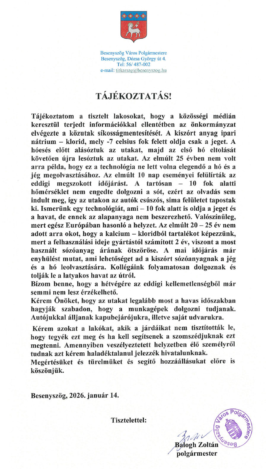 Magyarországon az elmúlt időszakban tapasztalható szélsőséges téli időjárási körülmények- havazás, tartós hideg, csúszós utak, közlekedési és ellátási nehézségek – különösen nagy kockázatot jelentenek az idősebb korosztály számára. A hideg időjárás következtében megnő az elesések, rosszullétek és egyéb rendkívüli élethelyzetek száma, amelyekben kulcsfontosságú a gyors segítségkérés lehetősége. Ezen rendkívüli helyzetre tekintettel felhívással élünk a településen élő…