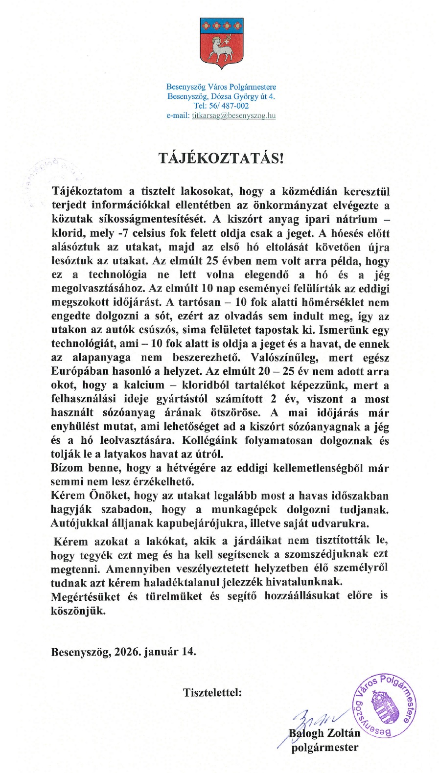 Magyarországon az elmúlt időszakban tapasztalható szélsőséges téli időjárási körülmények- havazás, tartós hideg, csúszós utak, közlekedési és ellátási nehézségek – különösen nagy kockázatot jelentenek az idősebb korosztály számára. A hideg időjárás következtében megnő az elesések, rosszullétek és egyéb rendkívüli élethelyzetek száma, amelyekben kulcsfontosságú a gyors segítségkérés lehetősége. Ezen rendkívüli helyzetre tekintettel felhívással élünk a településen élő…
