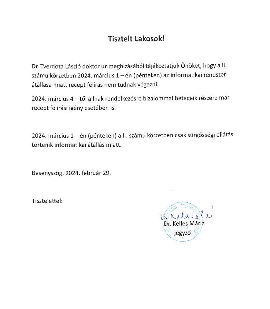 2024.03.14-én, csütörtökön Dr. Tverdota László praxisában a rendelés Dr. Imre Anikó helyettesítésével történik 11:00 és 15:00 óra között.