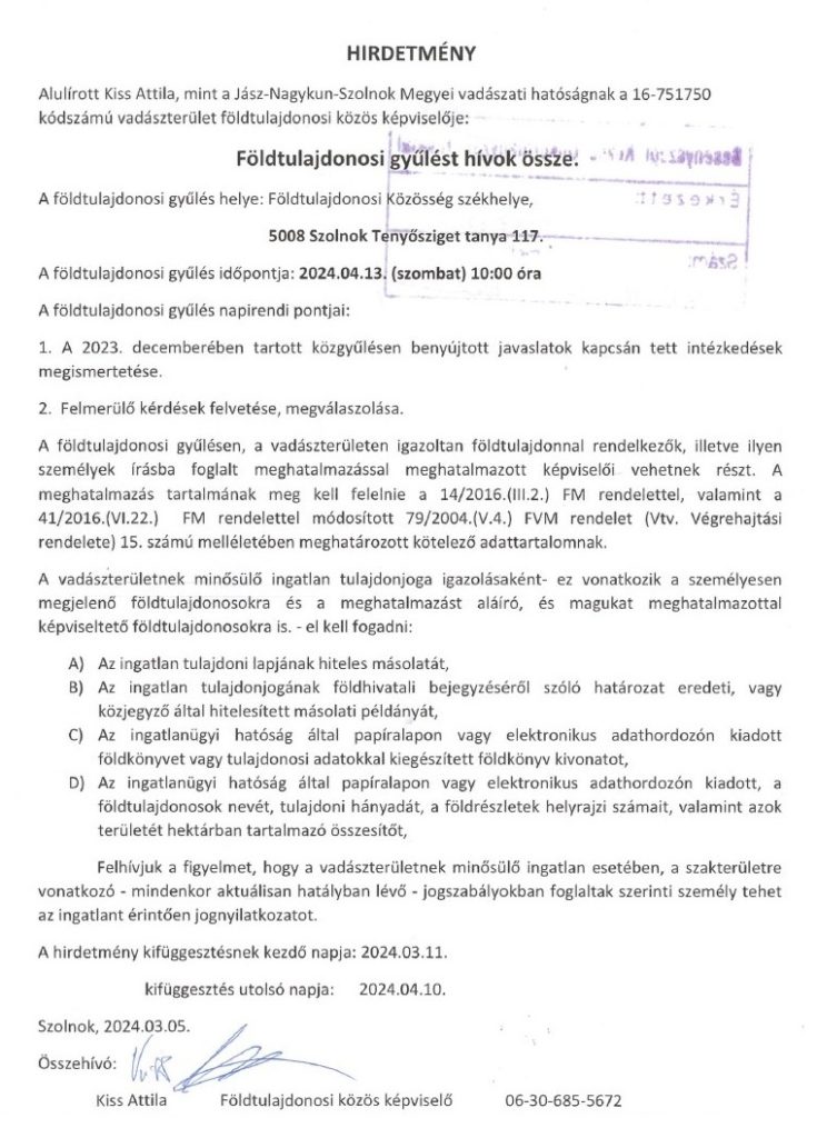 A Jász-Nagykun-Szolnok Vármegyei Kormányhivatal Agrárügyi Főosztály Földművelési Osztály 2024. május 9. 11:00 óra időpontban megismételt árverést tűz ki.