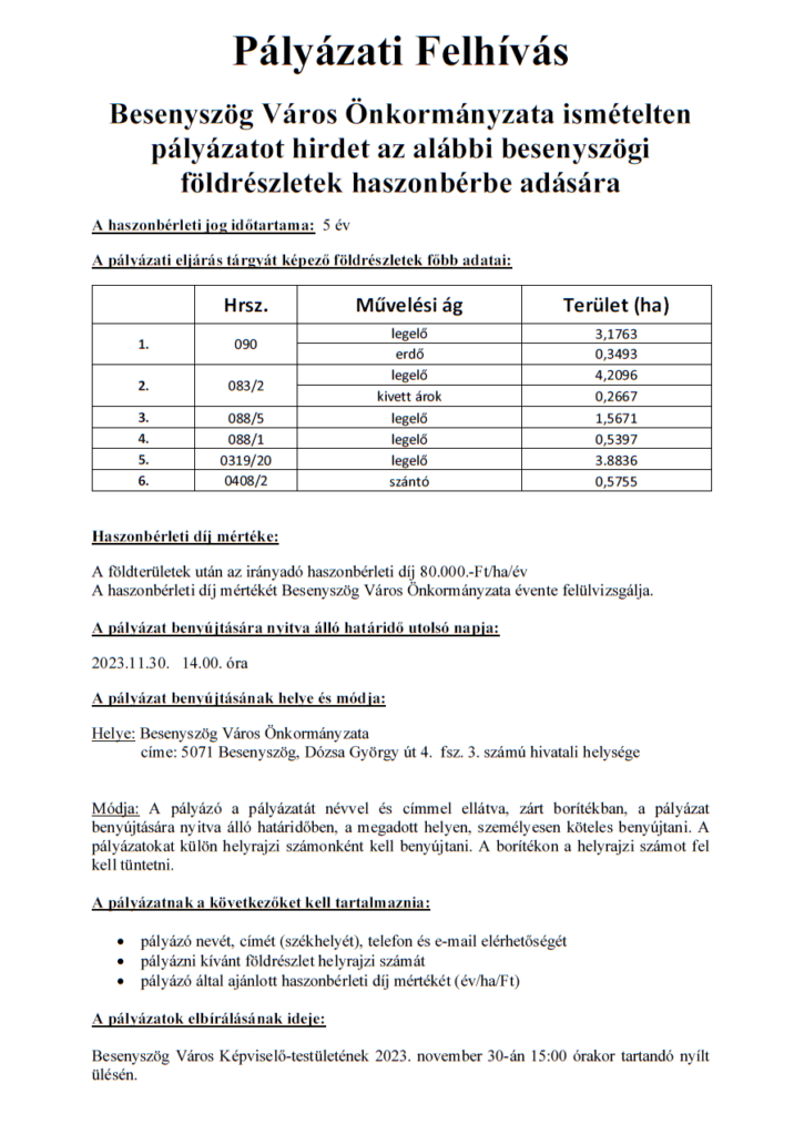 A Nemzeti Földügyi Központ a hirdetményben megjelölt árverési azonosító számmal ellátott földrészletekre vonatkozóan, a fővárosi és vármegyei kormányhivatalok közreműködésével nyilvános árverést folytatott le.