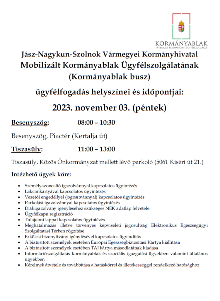 A Jász-Nagykun-Szolnok Vármegyei Kormányhivatal tájékoztatása alapján 2023. november 14. (kedd) napjától 2024. március 13. napjáig a hidegebb időjárási körülményekre való tekintettel felfüggesztésre kerül.