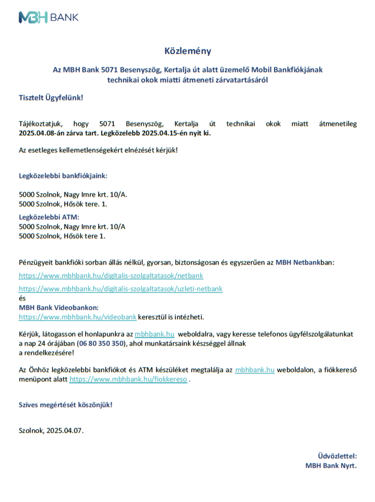 Az MBH Bank Nyrt. közleményt adott ki a mobil bankfiók menetrendjének visszaállításáról, a részletek megtekintéséhez kattintson a bejegyzés címére.