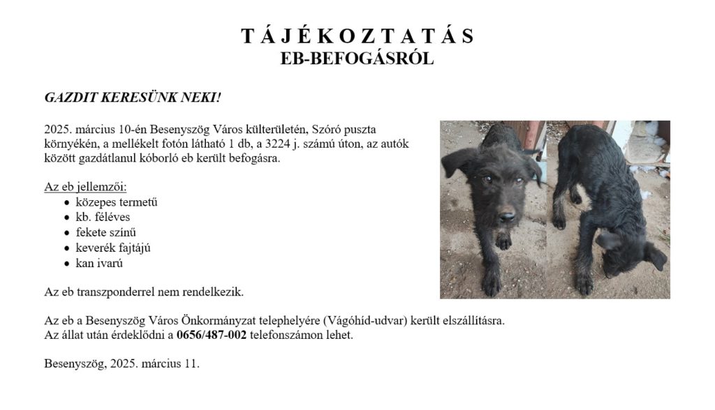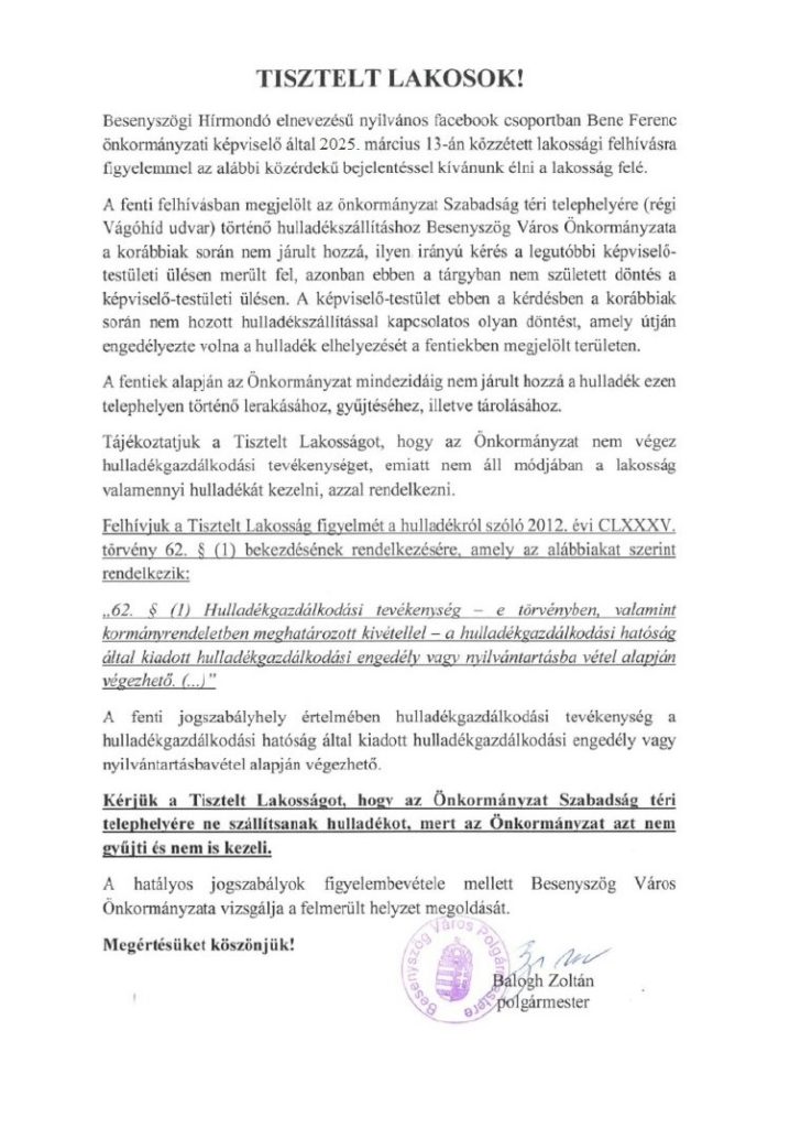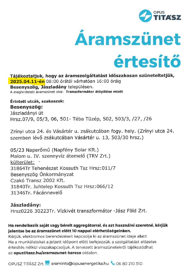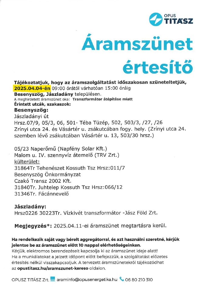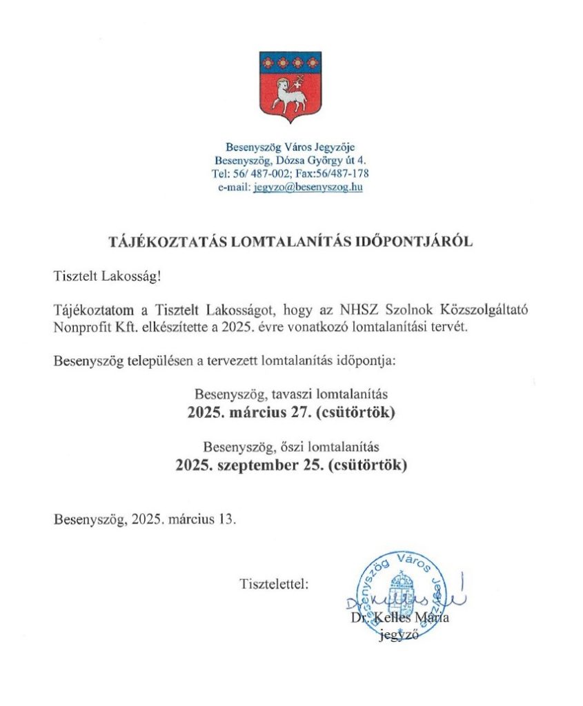 A Tiszamenti Regionális Vízművek Zrt. tájékoztatása alapján Besenyszög Város Önkormányzata értesíti a lakosságot, hogy a szolgáltató 2025.03.11-től 2025.03.31-ig az egészséges ivóvíz biztosítása érdekében Besenyszög ivóvíz hálózatán csőhálózat mosatást végez. Ebben az időszakban átmeneti nyomáscsökkenés fordulhat elő. Megértésüket és türelmüket köszönjük!